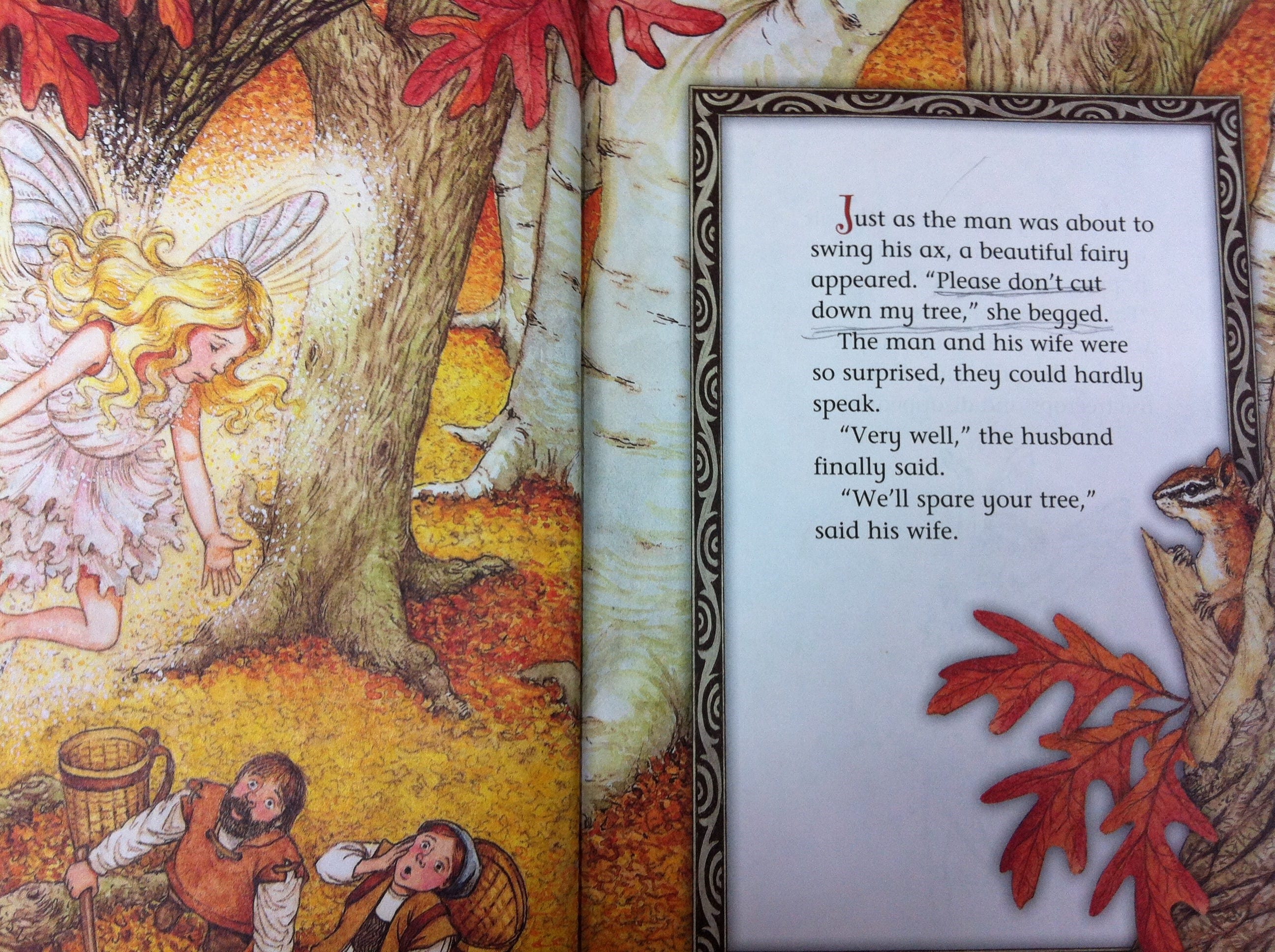 Just as the man was about to swing his ax, a beautiful fairy appeared. “Please don’t cut down my tree,” she begged.