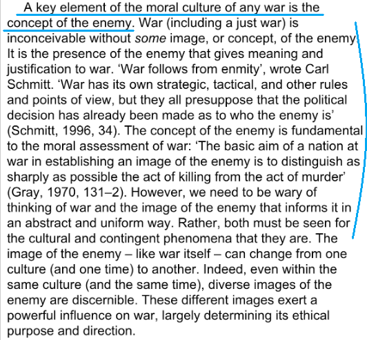 War is inconceivable without some image, or concept, of the enemy. It is the presence of the enemy that gives meaning and justification to war. ‘War follows from feelings of hatred’, wrote Carl Schmitt. ‘War has its own strategic, tactical, and other rules and points of view, but they all presuppose that the political decision has already been made as to who the enemy is’. The concept of the enemy is fundamental to the moral assessment of war: ‘The basic aim of a nation at war in establishing an image of the enemy is to distinguish as sharply as possible the act of killing from the act of murder’. However, we need to be cautious about thinking of war and the image of the enemy that informs it in an abstract and uniform way . Rather, both must be seen for the cultural and contingent phenomena that they are.