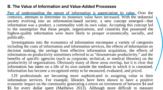 With the industrial society evolving into an information-based society, the concept of information as a product, a commodity with its own value, has emerged. As a consequence, those people, organizations, and countries that possess the highest-quality information are likely to prosper economically, socially, and politically. Investigations into the economics of information encompass a variety of categories including the costs of information and information services; the effects of information on decision making; the savings from effective information acquisition; the effects of information on productivity; and the effects of specific agencies (such as corporate, technical, or medical libraries) on the productivity of organizations. Obviously many of these areas overlap, but it is clear that information has taken on a life of its own outside the medium in which it is contained. Information has become a recognized entity to be measured, evaluated, and priced.