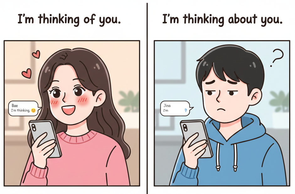 이 질 문을 받는 사람(여자/남자) 입장에서는 어느 쪽이 더 좋을까요? 대체로 **"I’m thinking of you"**가 더 로맨틱하게 들립니다. about은 '분석'이나 '고민'의 느낌이 섞일 수 있지만, of는 내 머릿속이 오직 '너'라는 존재로만 구체화되었다는 느낌을 주기 때문입니다. **"방금 네 생각 났어"**라는 뜻으로, 상대방이 내 삶의 중심에 있음을 즉각적으로 전달합니다.