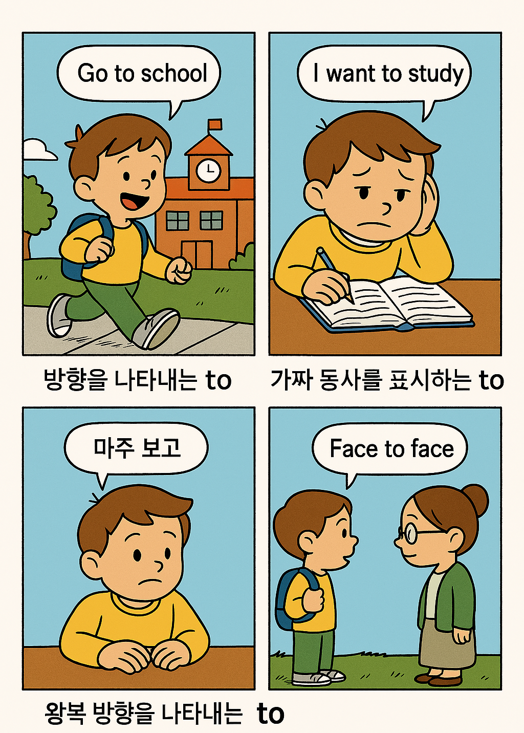 이때 to는 뒤에 오는 명사를 가리킵니다. 화살표처럼 목적지를 콕 집어주는 역할입니다.