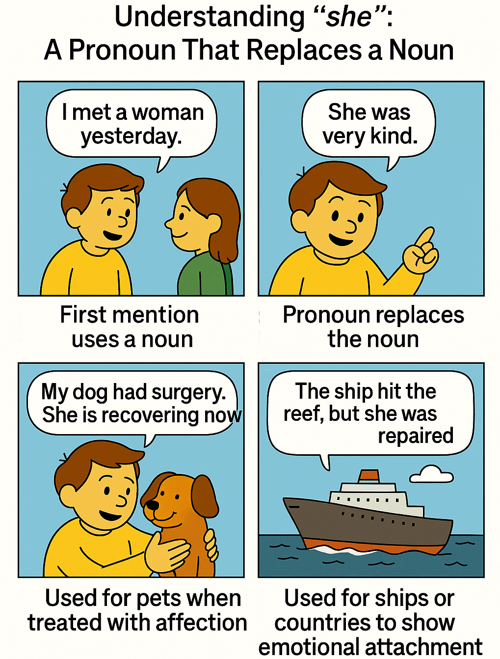 가장 많이 쓰이는 대명사 중 하나입니다. 대명사는 이미 나온 명사를 다시 말하지 않기 위해 사용합니다. 우리는 보통 she를 이렇게 외웁니다.