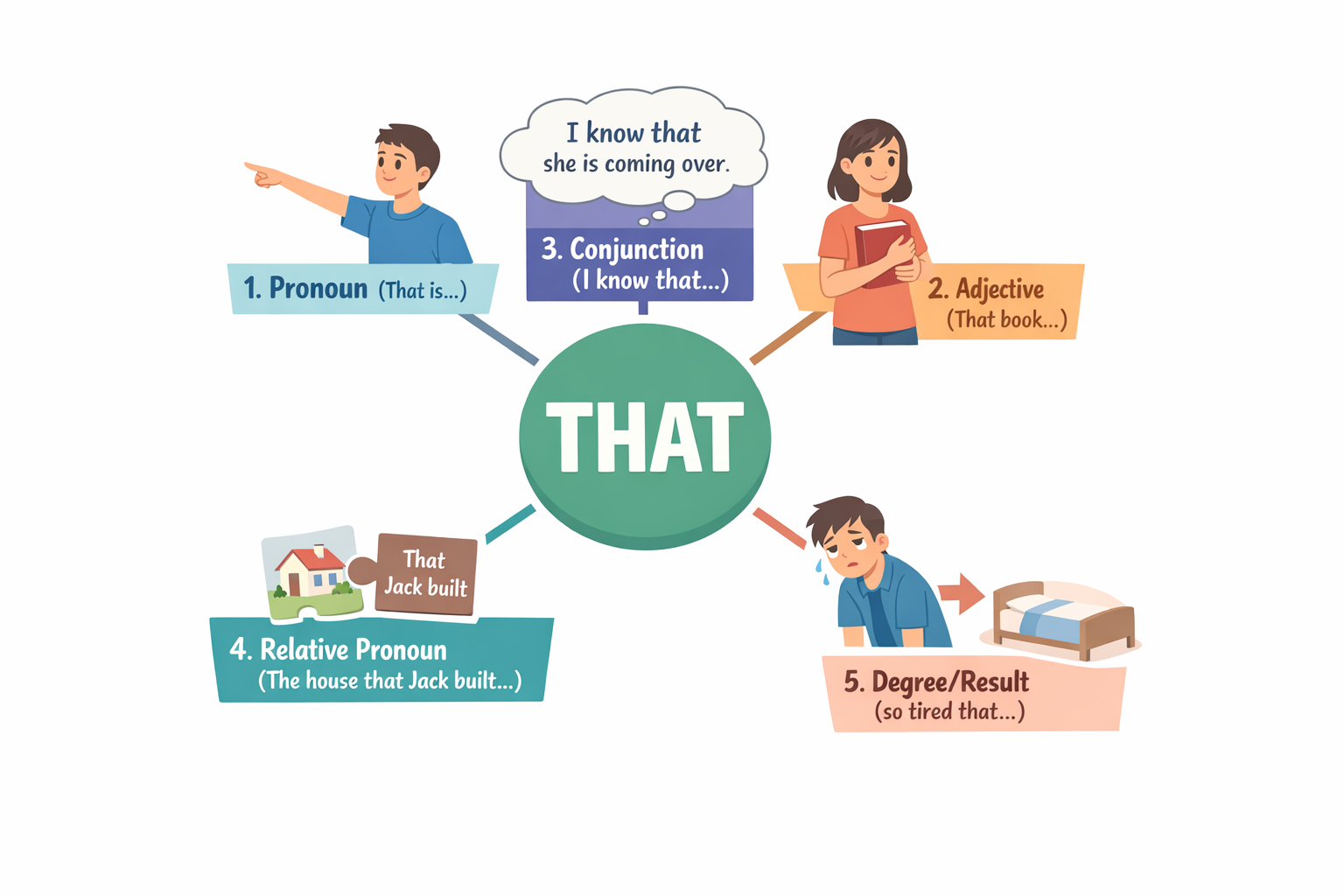 이 장에서는 that이라는 하나의 단어가 문장 안에서 어떤 역할로 변신하는지를 딱 다섯 가지로 나누어 정리합니다. 겉모습은 하나지만, 문장에서의 기능은 다섯 가지. 이 구분이 보이기 시작하면, that은 더 이상 헷갈리는 단어가 아니라 문장 구조를 알려주는 표지판이 됩니다.