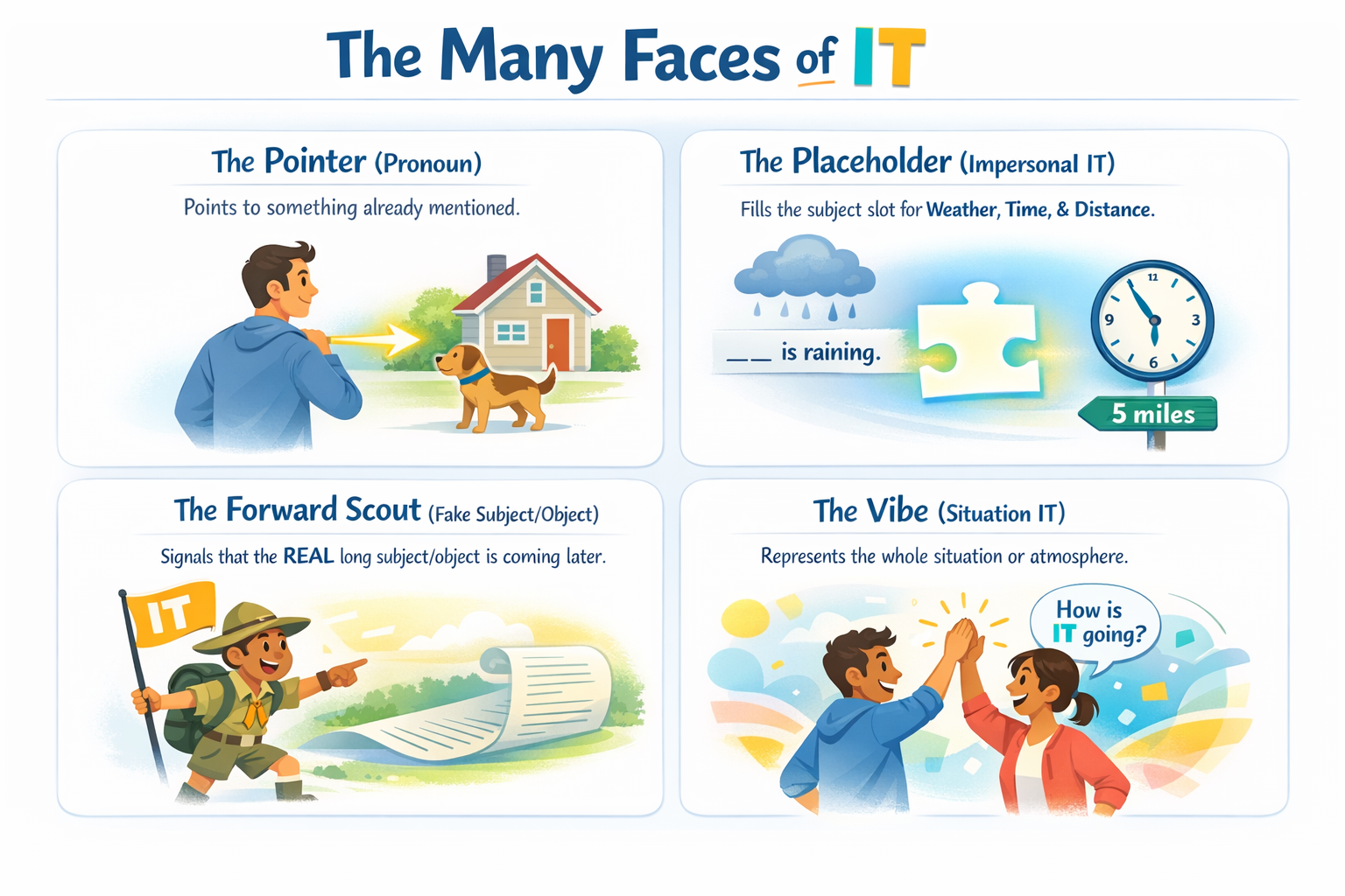 영어는 반복을 몹시 싫어하고, 문장의 구조(주어나 목적어 자리)가 텅 비어 있는 것을 참지 못하는 언어입니다. 그래서 가장 만만하고 쓰임새가 넓은 대명사인 it을 만능 블록처럼 사용합니다.