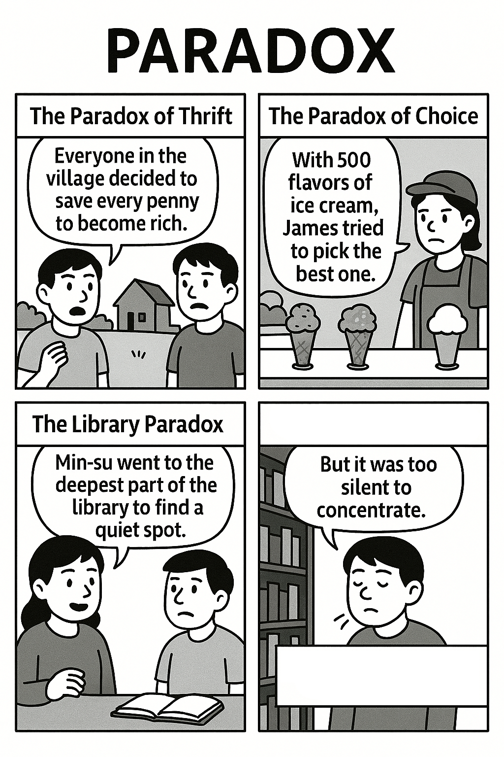 "Everyone in the village decided to save every penny to become rich. But since nobody spent any money, the local shops closed down, and soon everyone lost their jobs and became poor." (마을 사람들 모두가 부자가 되려고 한 푼도 안 쓰고 아끼기로 했습니다[A]. 하지만 아무도 돈을 쓰지 않자 가게들이 문을 닫았고, 결국 모두가 일자리를 잃고 가난해졌습니다[B]. 부자가 되려고 한 행동이 오히려 가난을 불러온 역설적인 상황입니다.)